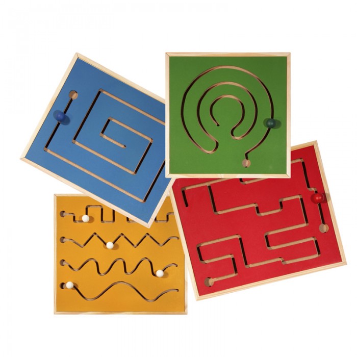 Kit com 4 painéis de estimulação com diferentes movimentos. Confeccionados em M.D.F e madeira. Cortado a laser com desenhos vazados em forma de cursos para passar os pinos. Painéis pintados nas cores vermelho, verde, amarelo e azul, com tinta atóxica. Tamanho médio das pecas: 30 x 30 x 2 cm.